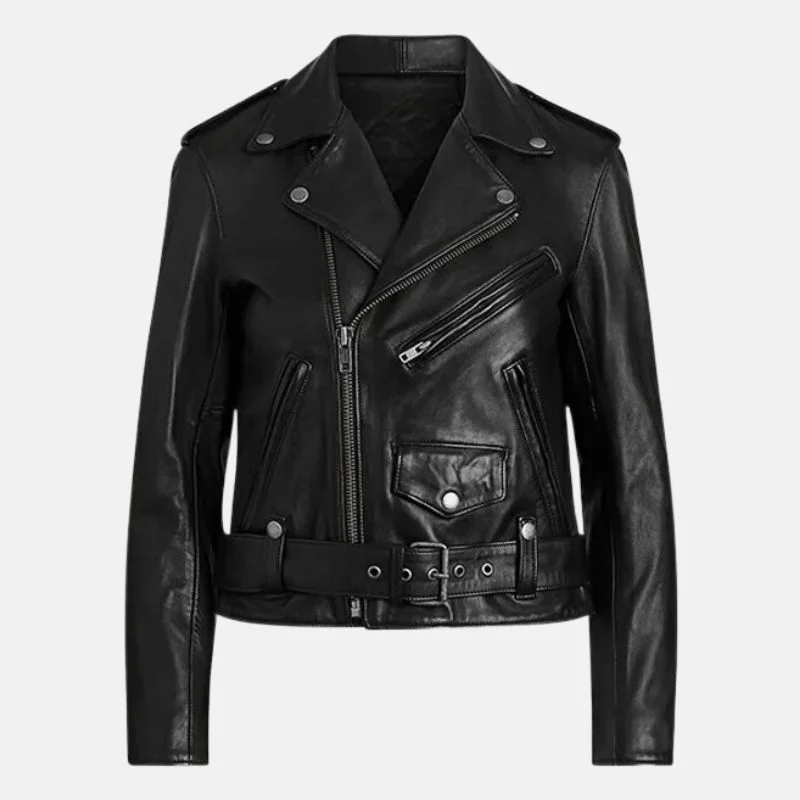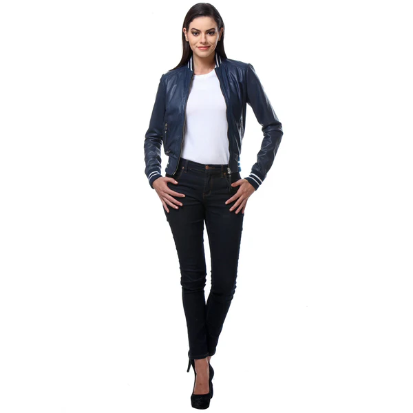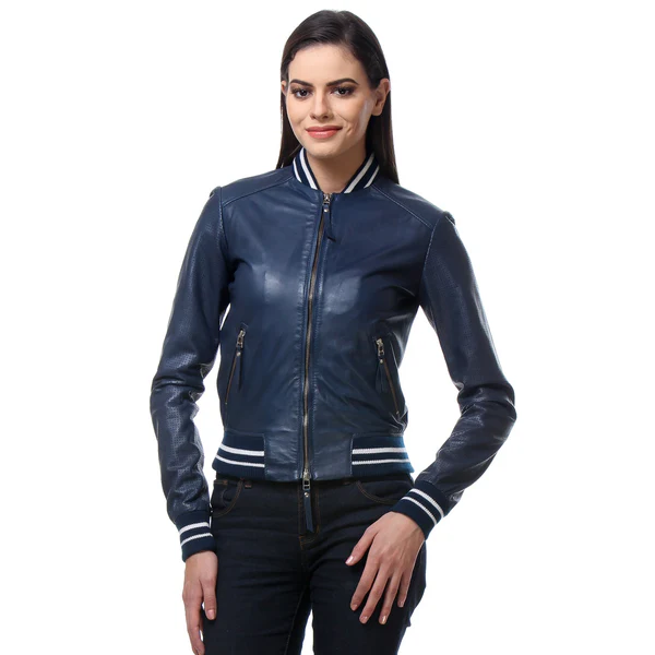 Blue Color Classic Leather Ribbed Bomber Jacket For Women