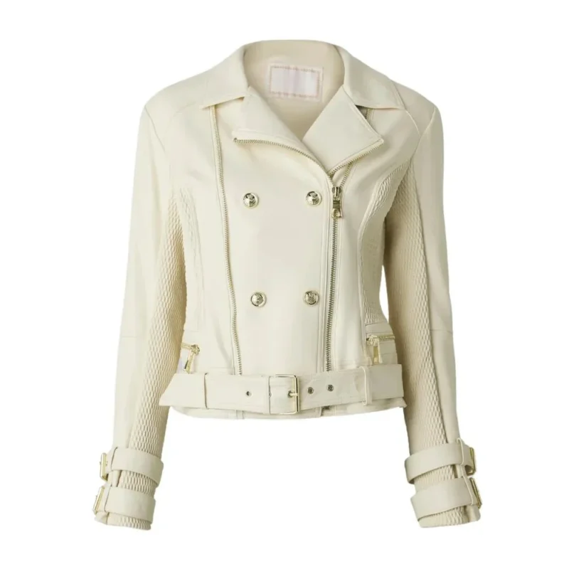 Women’s Double Breasted Dove White Leather Biker Jacket