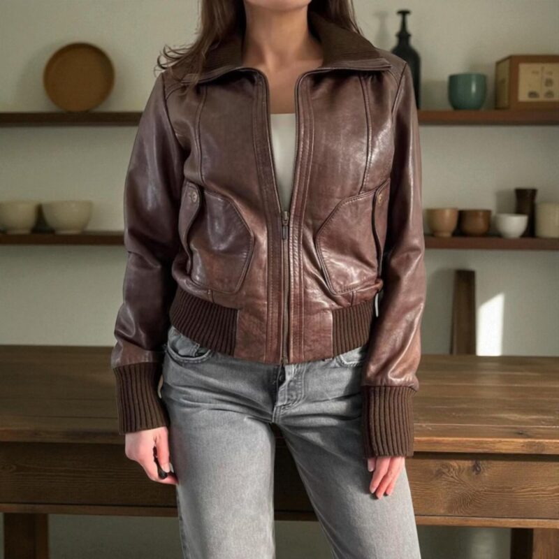Women’s Brown Leather Bomber Jacket Vintage Style Winter Casual Outerwear