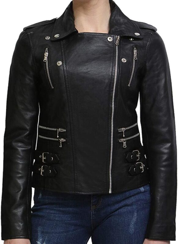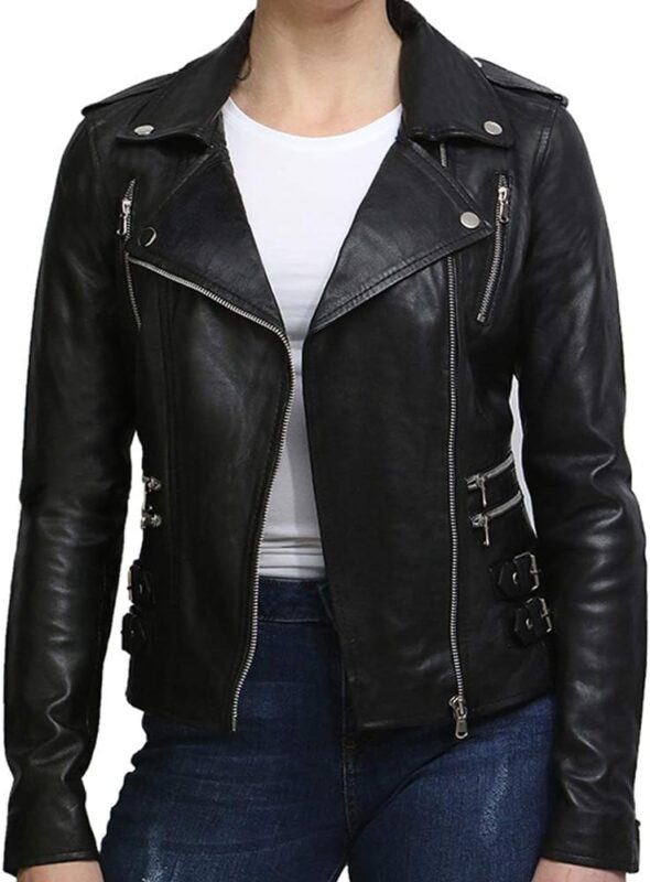 Women’s black leather biker jacket Slim Fit Moto Style Zip Up Motorcycle Outerwear