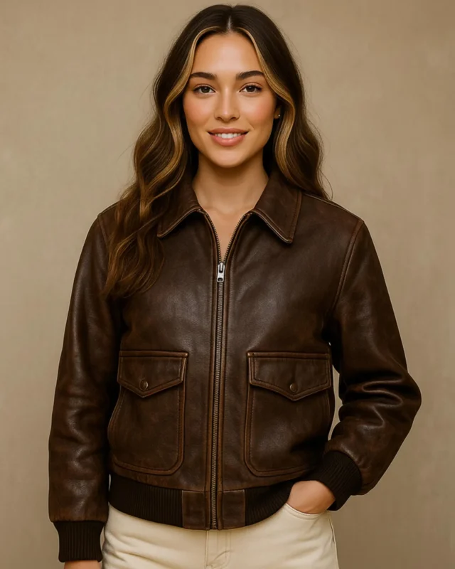 Women’s Bomber Leather Jacket-Handcrafted Brown full grain leather Coat-fashion Outwear