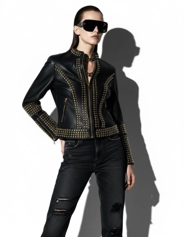 Handmade Studded Black Leather Jacket • Gold Stud Embellished Women’s Designer Statement Biker Coat