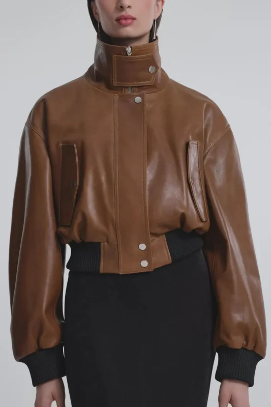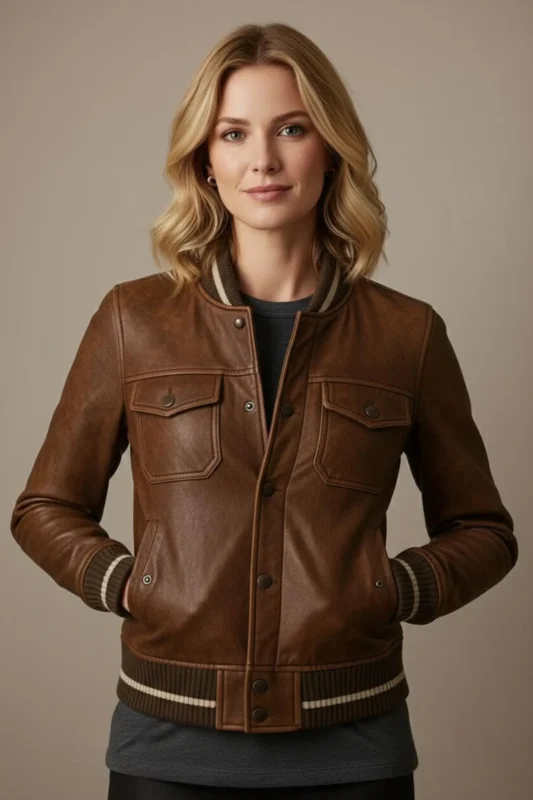 Handmade Women’s Brown Leather Bomber Jacket with Ribbed Cuffs