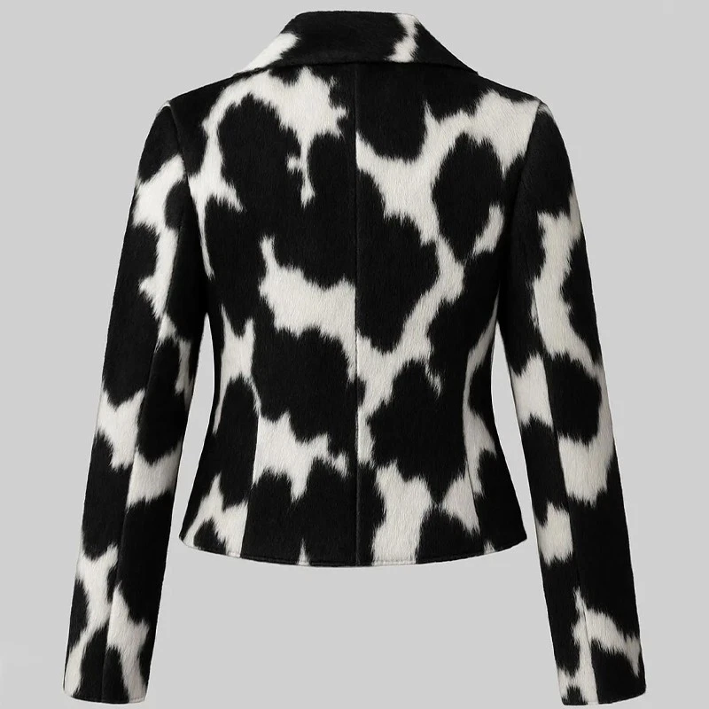 Genuine Cowhide Leather Biker Jacket Black and White Cow Print Outerwear Jacket