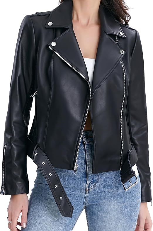Lambskin Leather Jacket Women,Motorcycle Jacket,Classic Asymmetrical Zip Style,Buckle Belts,Multiple Pockets