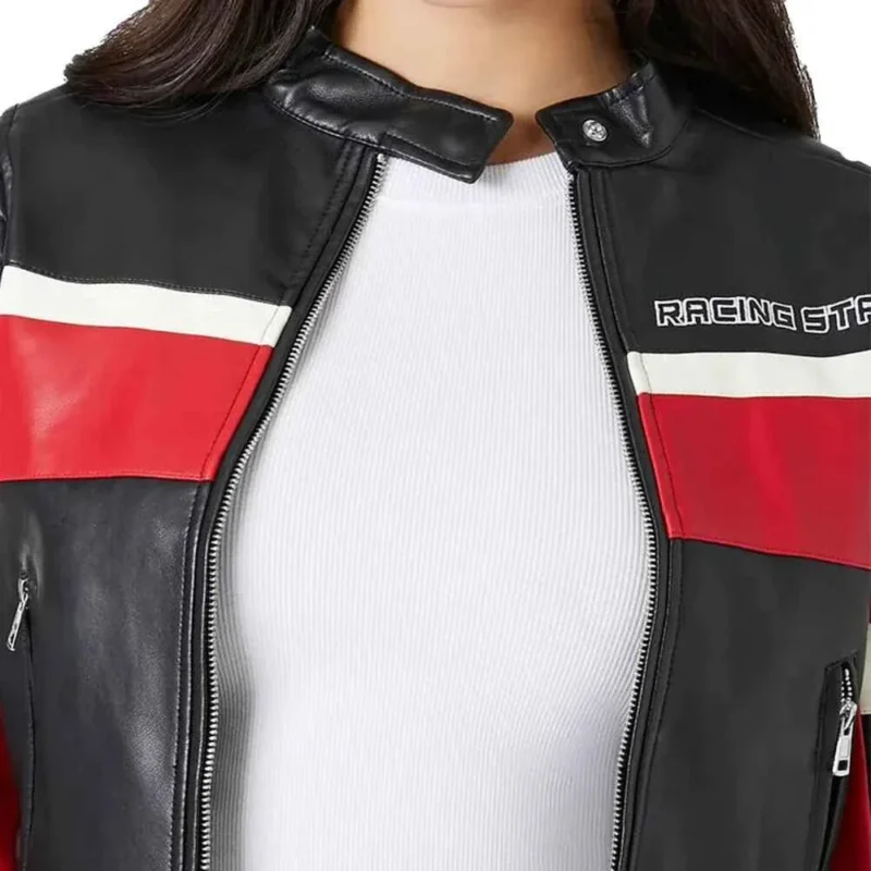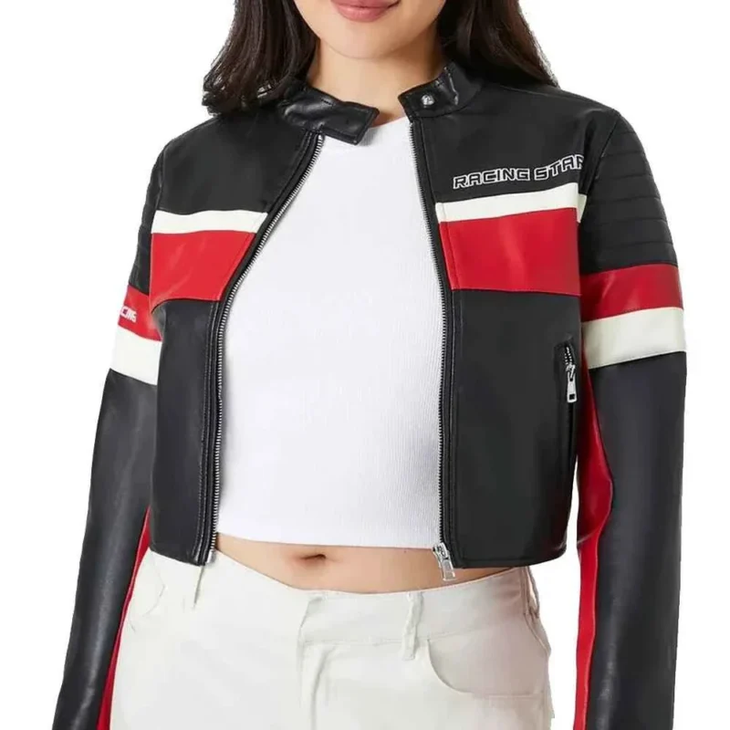 Ladies Cropped Red Black and White Leather Jacket
