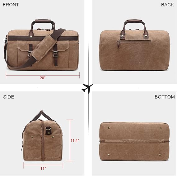 BUILT TO LAST: Size in 20″L * 11″W * 11.4″H that meets airline carry on luggage restrictions, the travel duffel bag is made of waterproof cotton canvas and genuine leather, trimmed with metal SBS zippers and classic bronze tone hardware, which offers the durability for long-term use. Packing Up Your Stuff All Together.