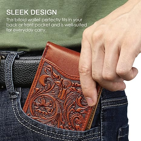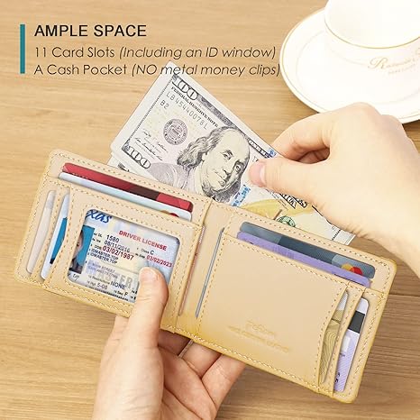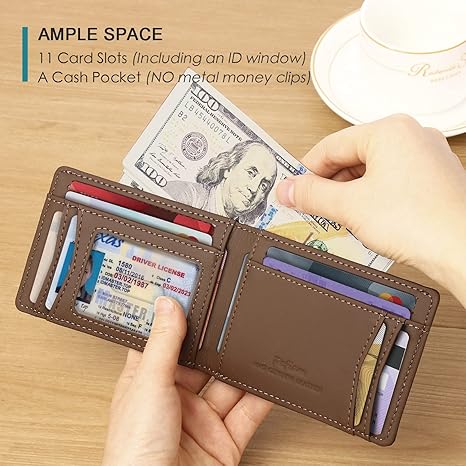 Multiple Card Slots: With 11 card slots (including an ID window) and a cash pocket, this wallet for men leather offers ample space to hold all of your business cards, credit and debit cards, bills, etc. Measuring just 4.5 x 3.2 inches when folded, our wallet for men bifold is slim enough to slip into your jeans or front pocket without adding bulk.