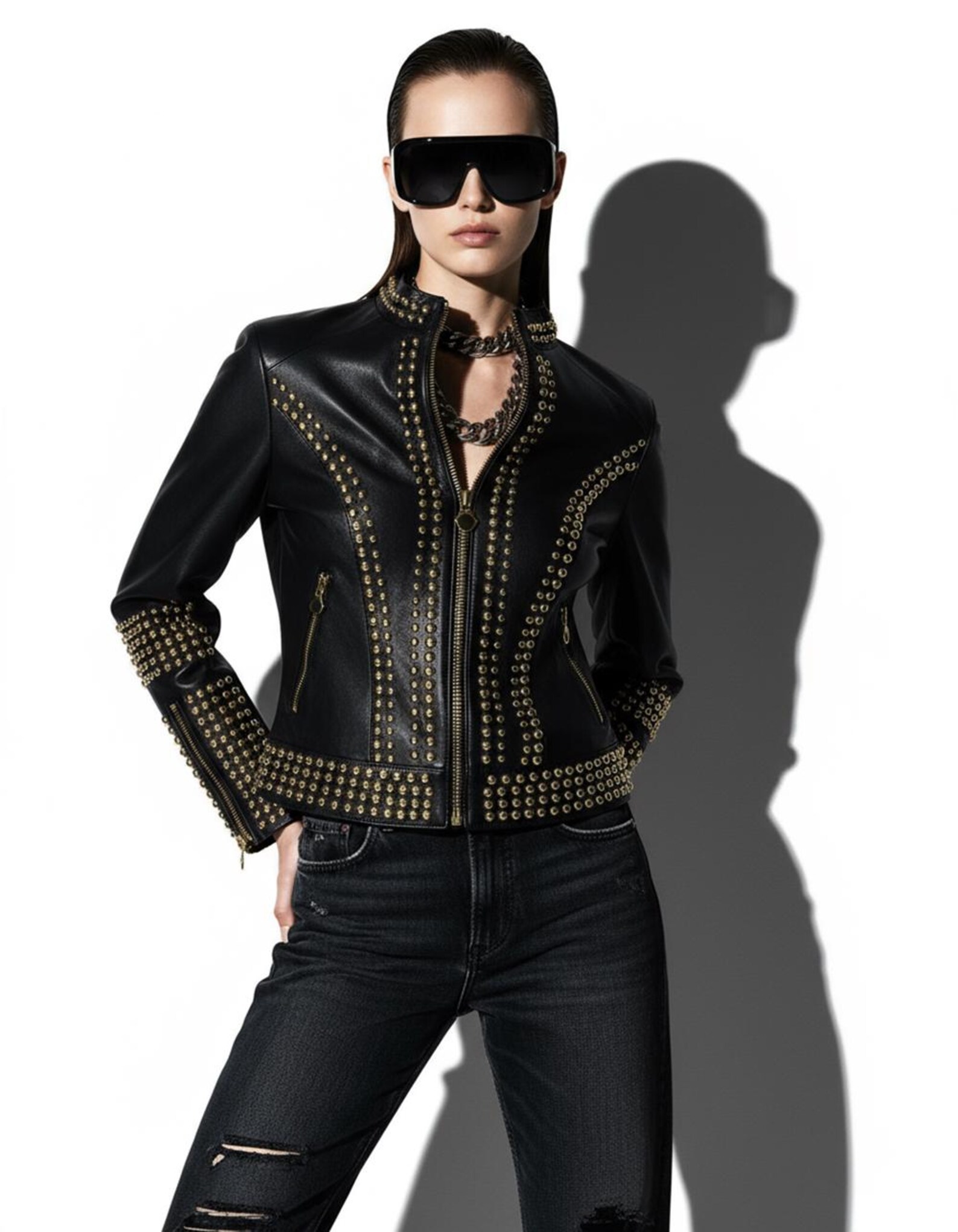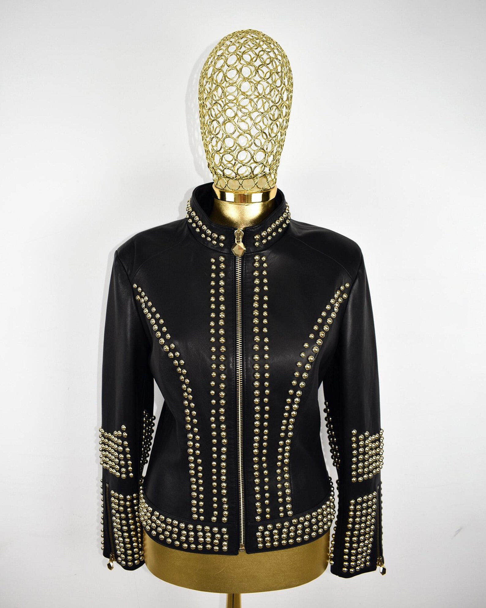 This bold and luxurious black leather jacket is fully handmade and adorned with hundreds of individually applied gold studs. Designed for those who love statement fashion, it blends premium craftsmanship with a striking, high-impact look.