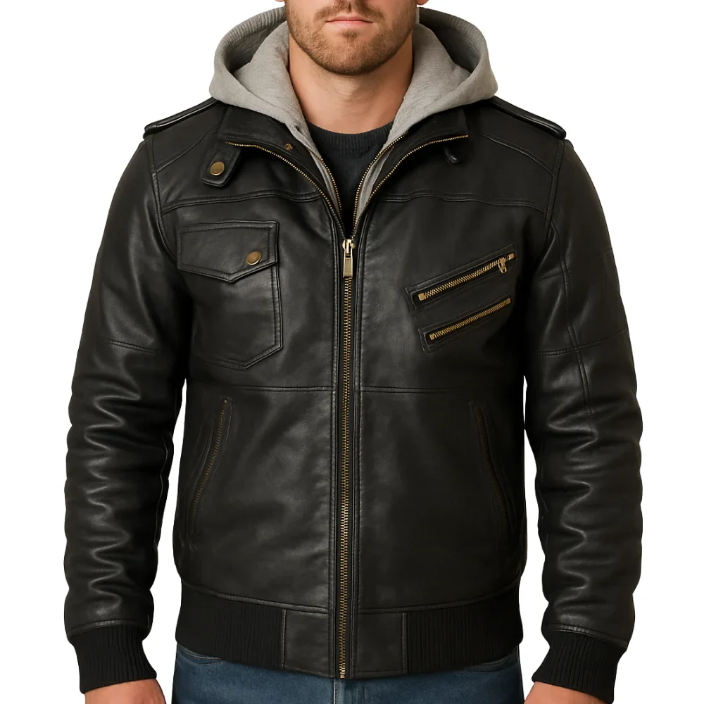 Mens Black Leather Bomber Jacket With Removable Hood