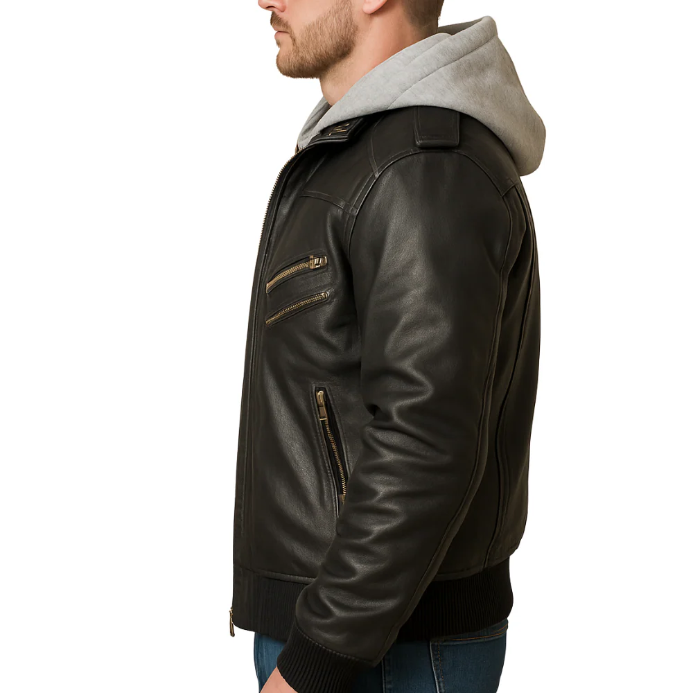 Introducing the Mens Black Leather Bomber Jacket With Removable Hood with a Removable Hood a versatile piece that’s both stylish & practical. Crafted from 100% premium leather in sleek black, it’s perfect for any guy wanting to make a statement. Its rib knit cuffs & hemline offer a comfortable fit while keeping you warm. Style it with a simple white t-shirt, distressed jeans, & sneakers for a laid-back yet trendy look.