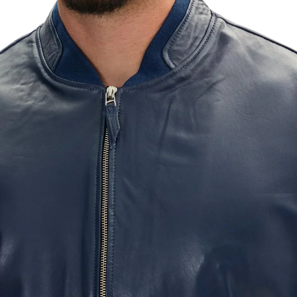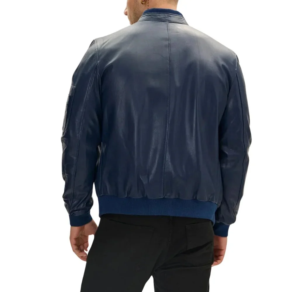 Men’s Navy Blue Real Leather Bomber Jacket