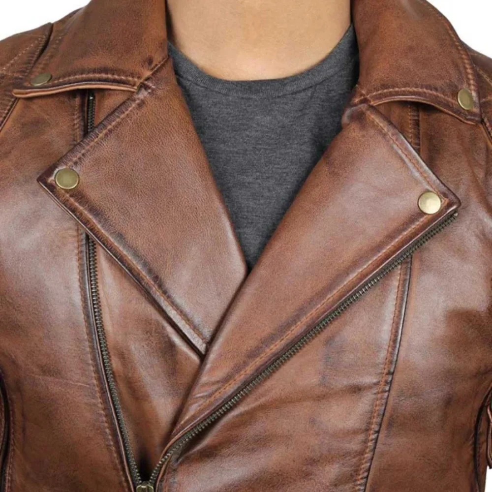The asymmetrical design sets this brown leather jacket apart from traditional biker silhouettes, offering a fresh and contemporary look that will turn heads wherever you go. The off-center zipper closure adds to the edgy appeal, while the satin lining ensures maximum comfort and a perfect fit
