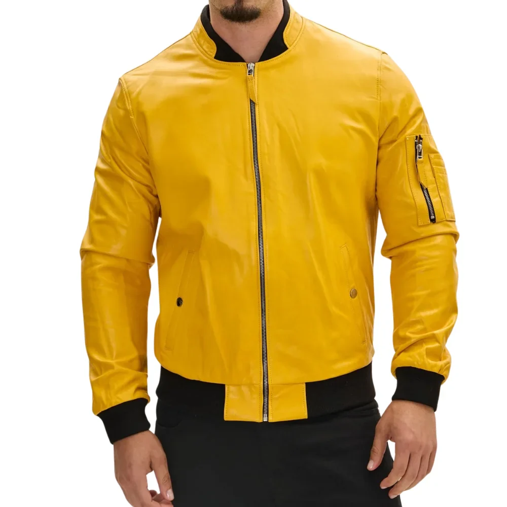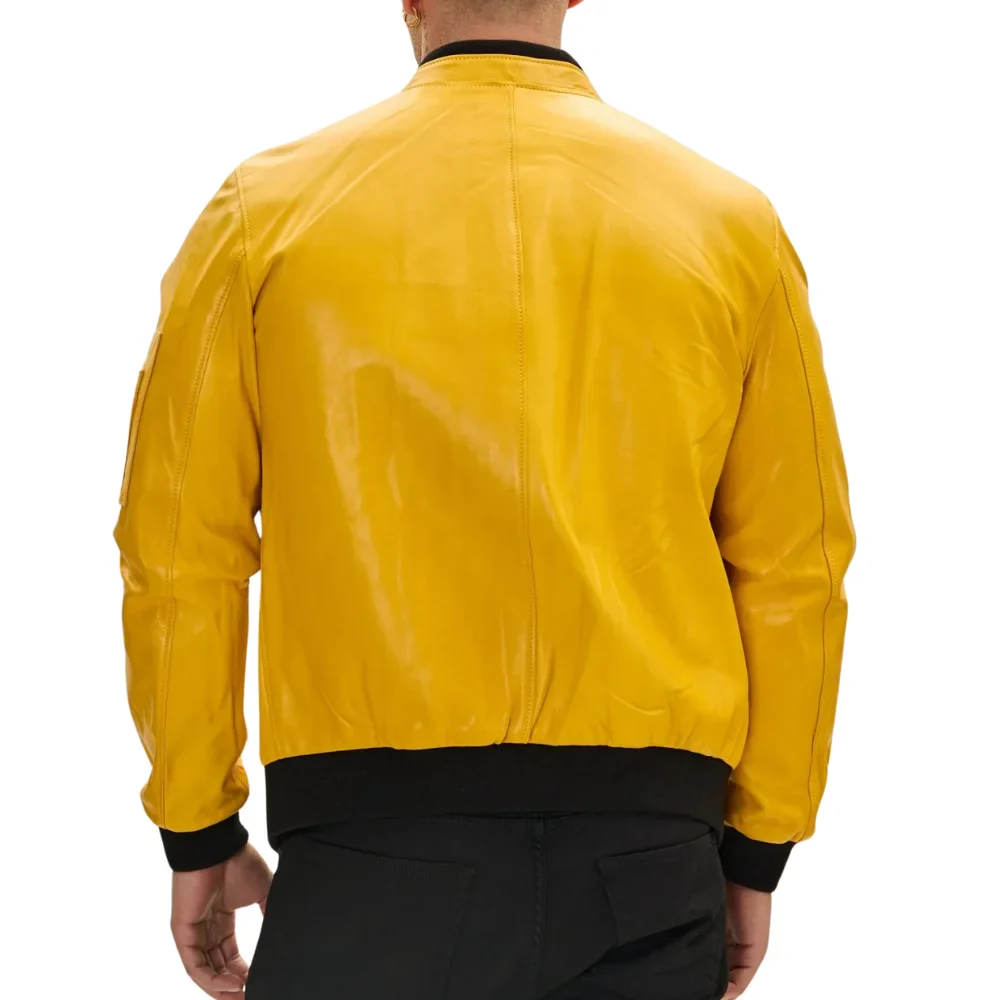 Mens Real Lambskin Yellow Leather Bomber Jacket