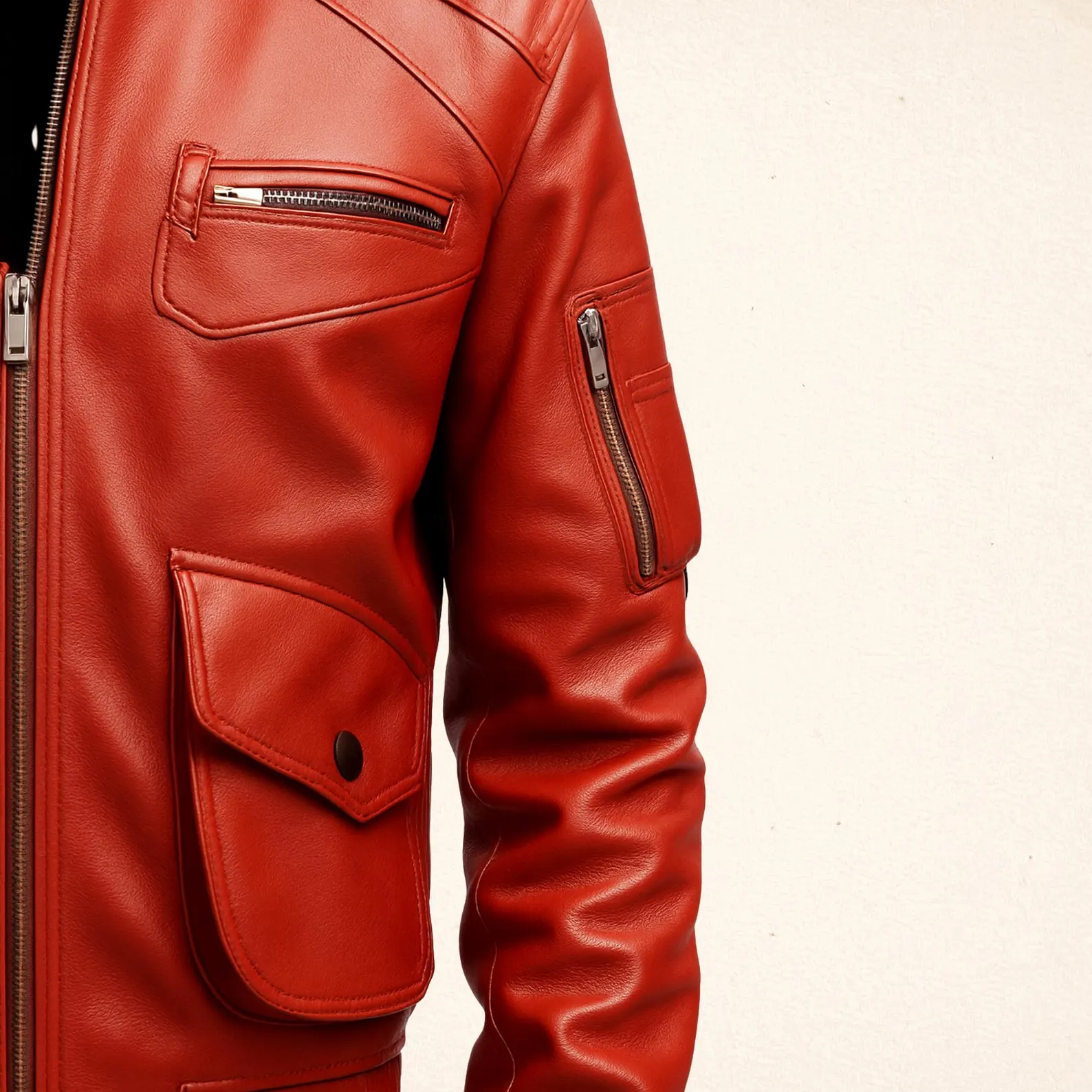 This bold red leather bomber jacket is crafted from premium genuine leather, offering both durability and timeless style. With its sleek, fitted design and ribbed cuffs and hem, it’s perfect for anyone looking to make a statement. Featuring multiple utility pockets and a front zipper closure, it combines functionality with high-end fashion.