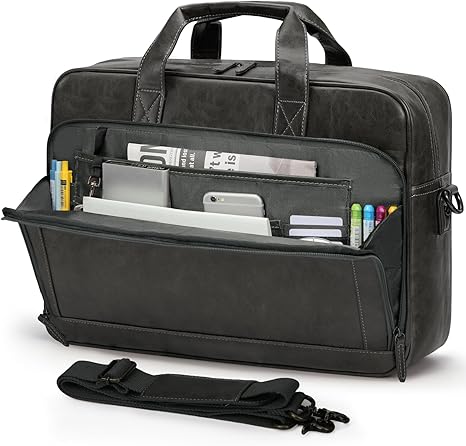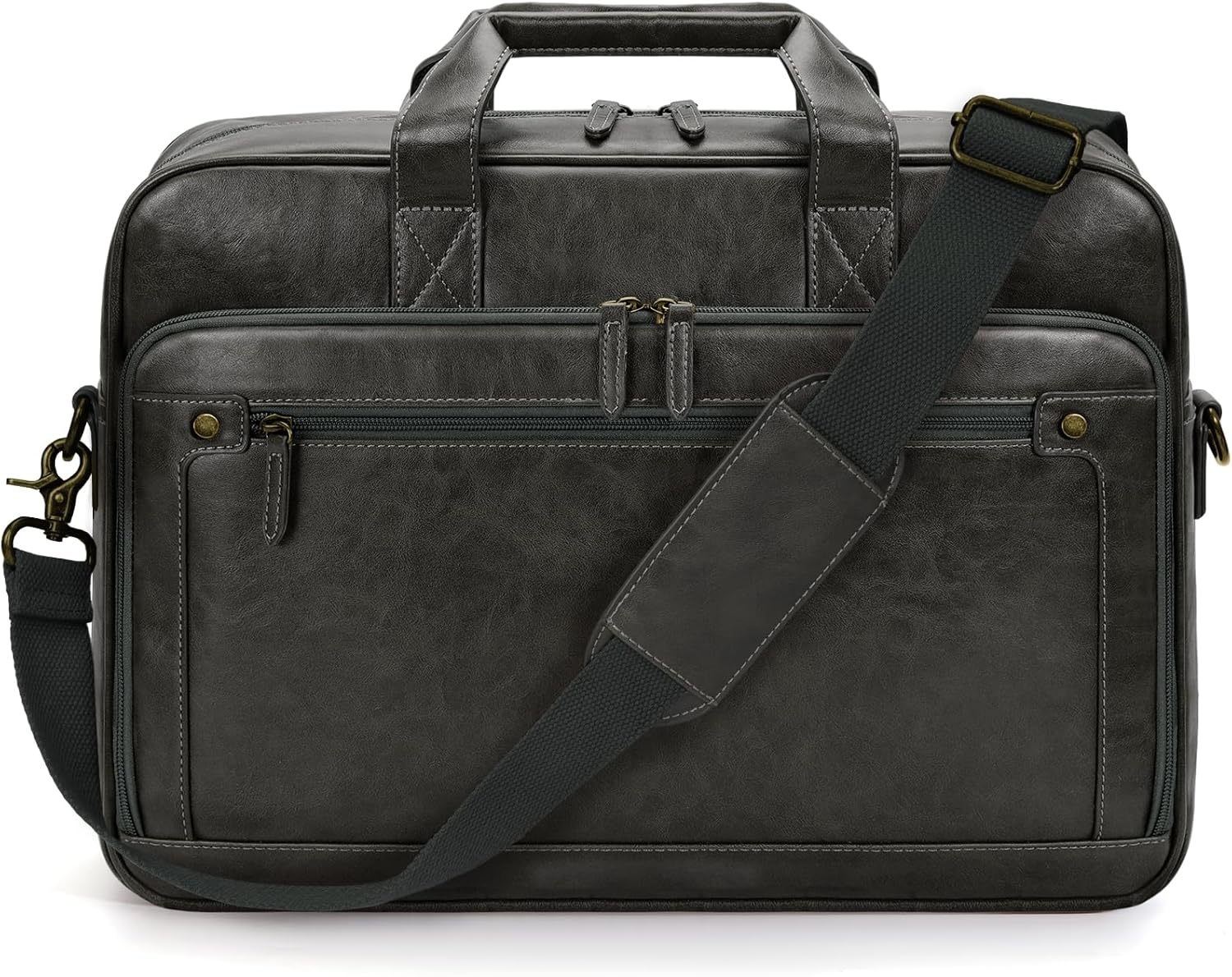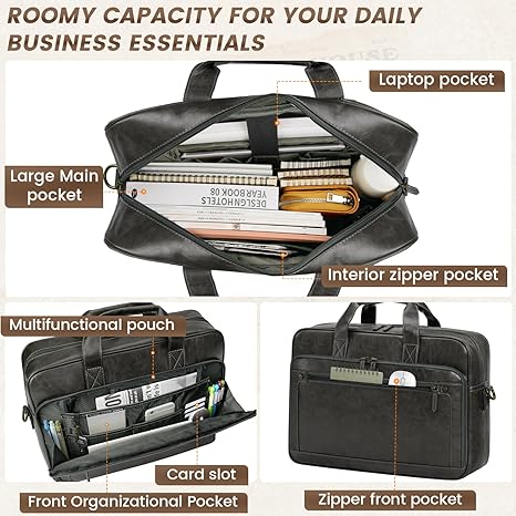 Large Capacity & Multiple Pockets: The leather laptop bag has spacious compartments that provide separate space for a 16 inch laptop, iPad, documents, and all your belongings. It has multiple pockets, including a padded laptop pocket and a main compartment with a zippered pocket. The front compartment has multiple slots and a keychain. There is a front zipper pocket for easy access to personal items. It keeps everything organized and within reach, which is a perfect business briefcase for men.