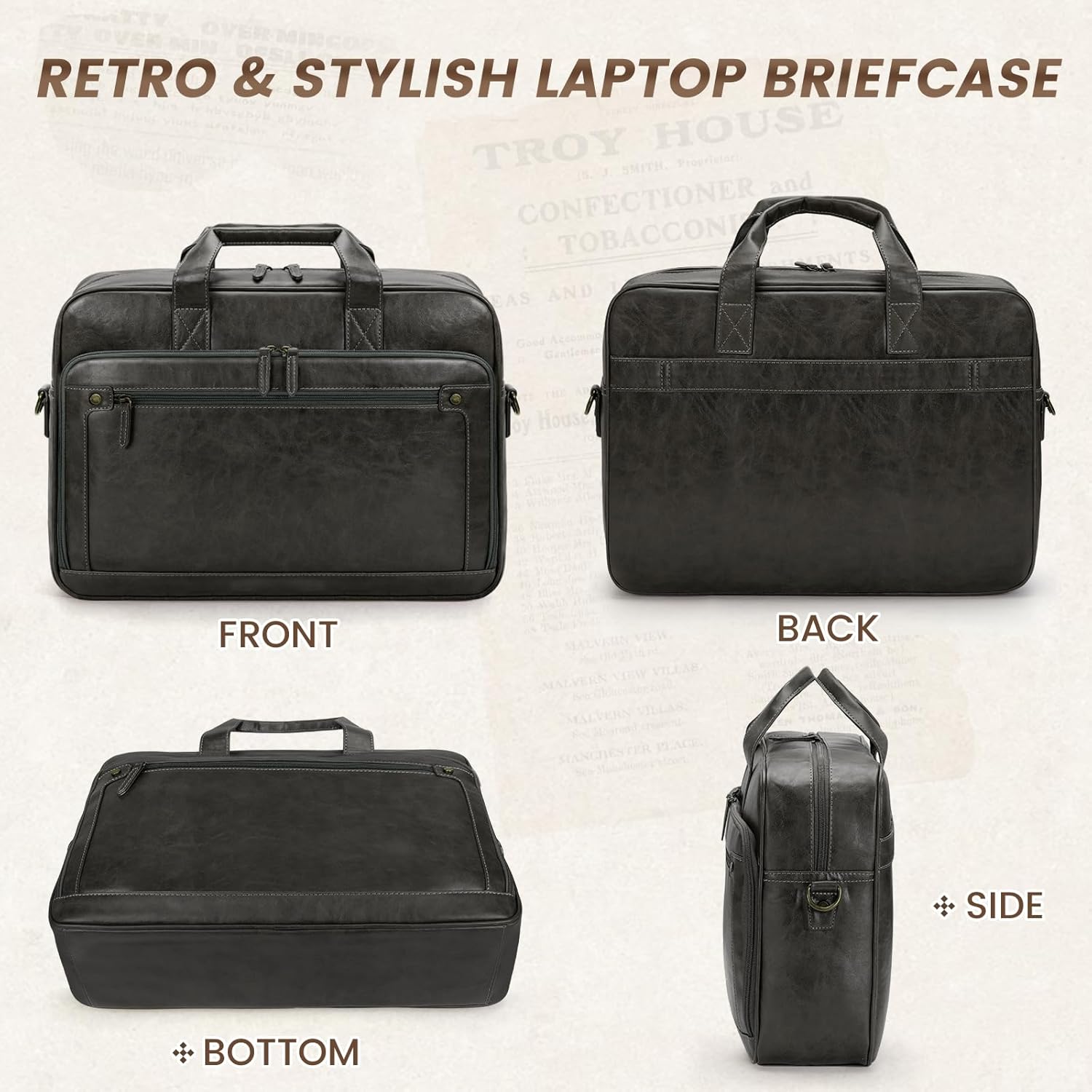 Durable & Vintage Laptop Briefcase: This laptop briefcase is made of soft-textured PU leather with a cowhide pattern and features metal zippers, durable antique brass hardware, and strong stitching for long-lasting reliability. The thick nylon lining and protective foam compartment ensure that your laptop is protected from impacts. Its design seamlessly blends practicality and style, making it a standout leather laptop bag for men, an essential briefcase, and a professional work bag.