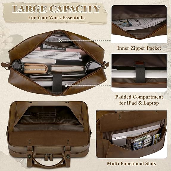 Large Capacity: This laptop briefcase has ample space to store all items. One independent padded laptop compartment can protect a 16-inch laptop and iPad from accidental collisions. The main compartment is used to store files, books, etc. There is one inner zipper pocket for storing valuable items. In addition, there is 1 front compartment, which contains 1 large open compartment, 2 slip pockets, 6 card slots, and 1 pen leather holder strap, for storing the items you want to carry easily