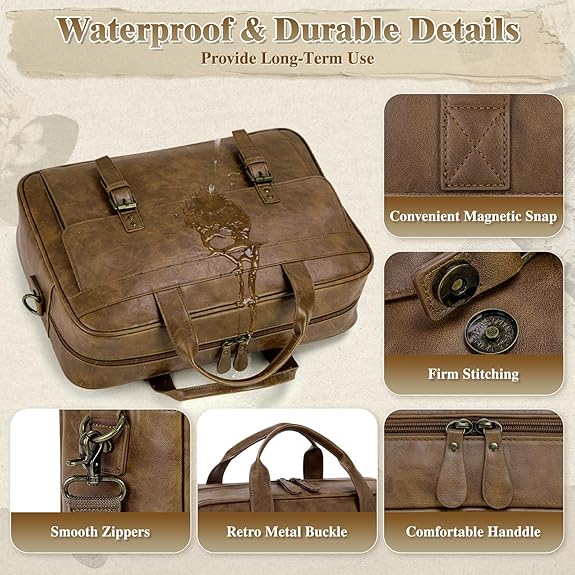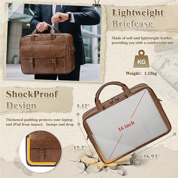 Waterproof Retro Laptop Briefcase: This retro laptop briefcase is made of high-quality PU leather, featuring fine texture and natural luster. It feels soft yet firm, making daily maintenance more worry-free. Durable brass hardware ensures lasting reliability, and thick padding protects your laptop from impact. It can hold a 16-inch laptop and is perfect for urban commuters who need a waterproof leather men’s laptop bag. It can seamlessly transition to office meetings and rainy day trips