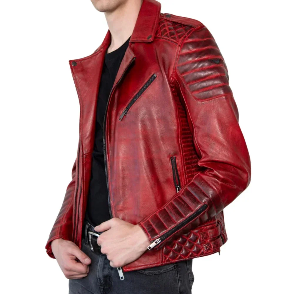 Red Real Leather Biker Jacket Men’s with Quilted Details