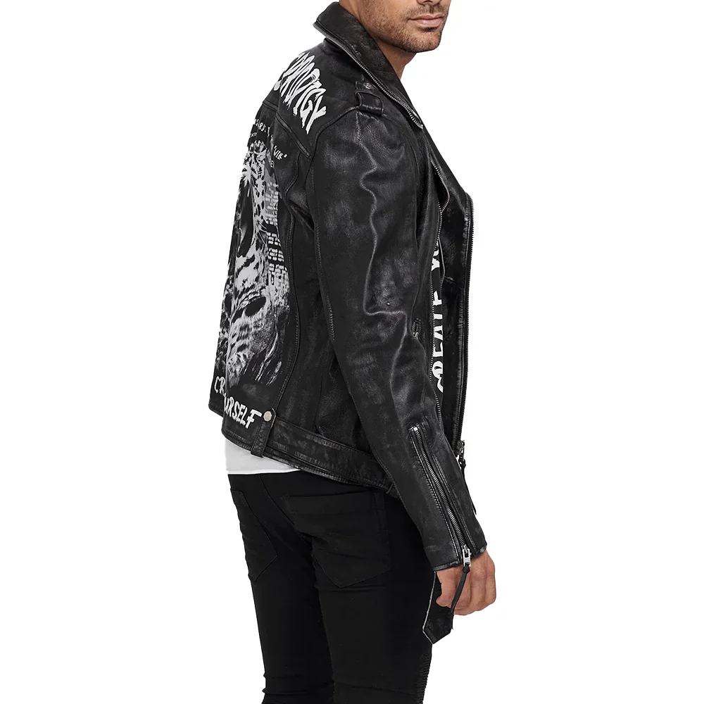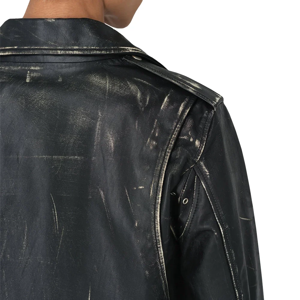 Classic meets rugged in this matte black leather biker jacket for Men’s. Crafted from 100% Premium leather, this jacket features an asymmetrical front zipper and adjustable waist belt for a customized fit. Subtle distressing offers a vintage-inspired look, while brushed metal hardware adds durability. With full-length sleeves, zippered cuffs, and shoulder epaulets, this slim-fit design combines timeless biker style with modern edge, making it a versatile addition to any wardrobe.