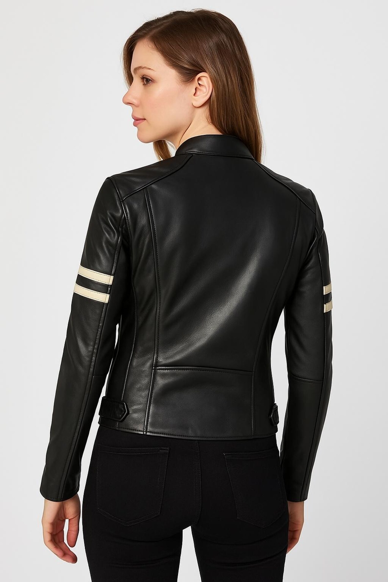 Women’s Black Leather Biker Jacket: Cream Stripe Slim Fit Moto jacket