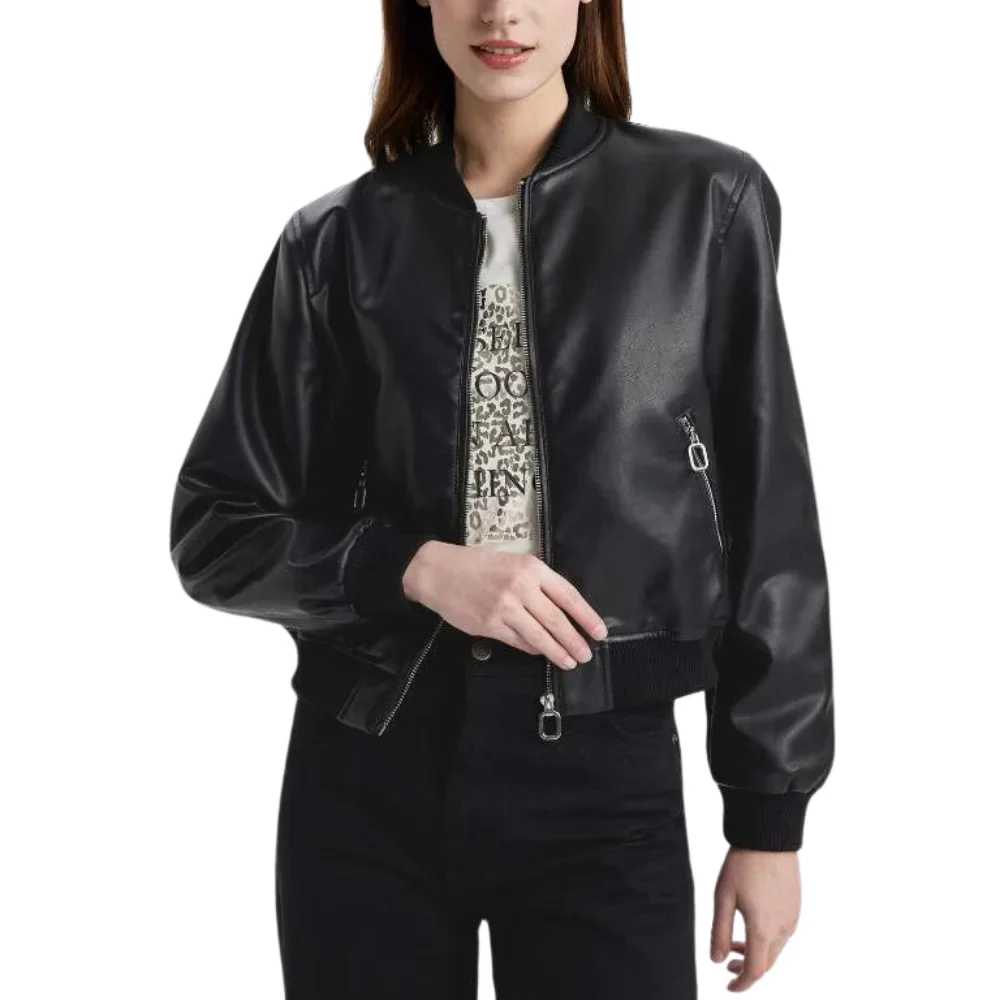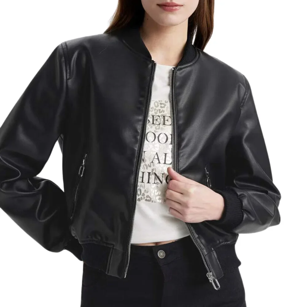 Cropped Black Leather Ladies Bomber Jacket