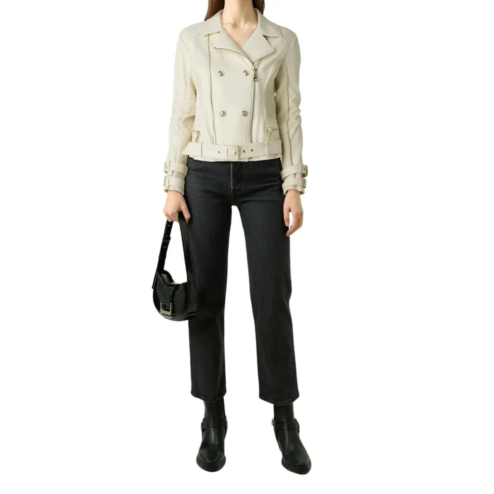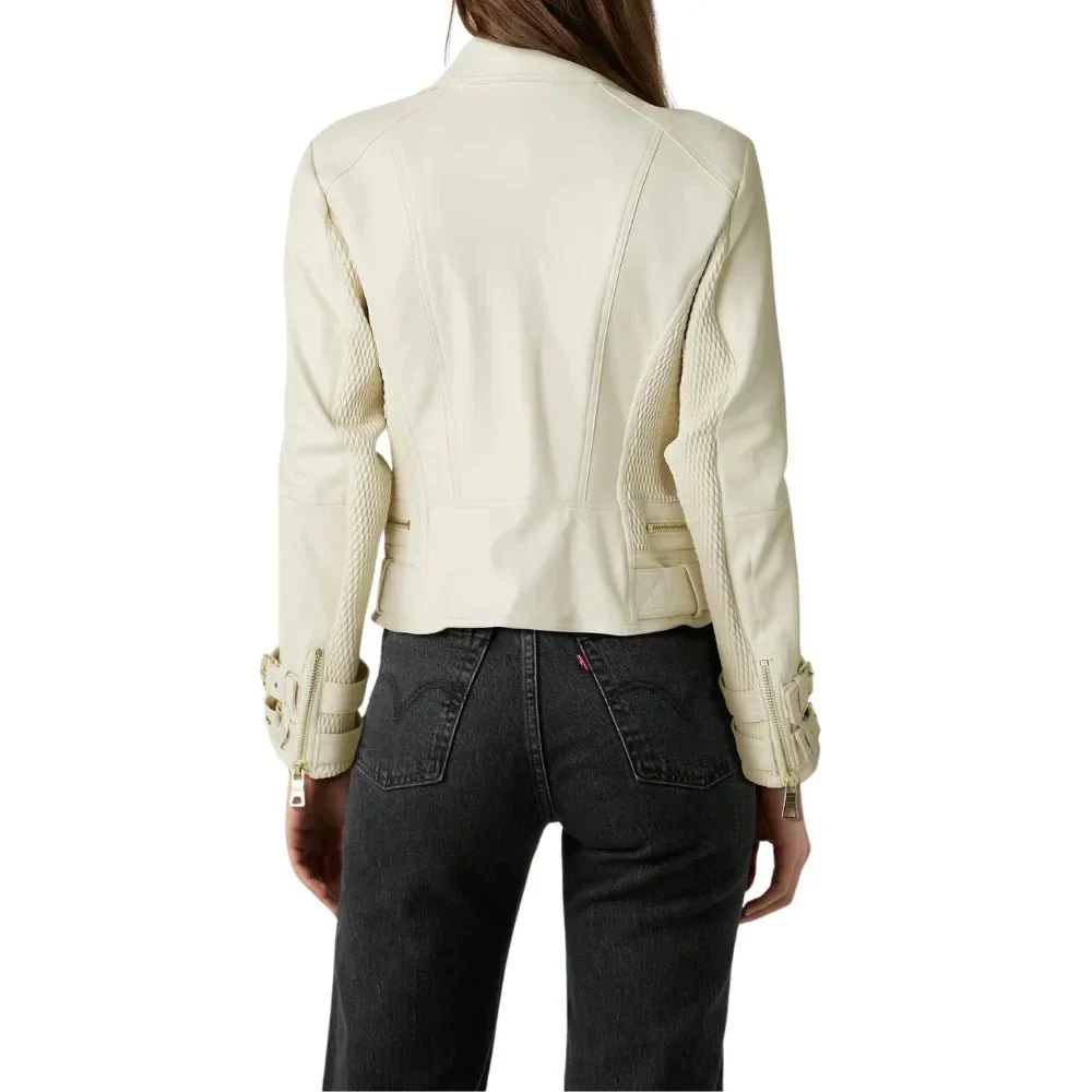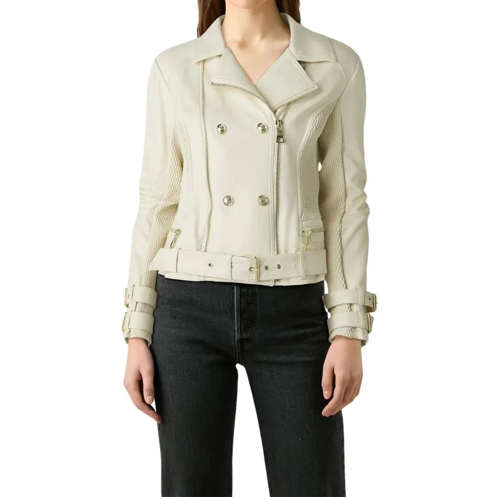 Double Breasted Lapel Collar Dove White Leather Moto Jacket for Women’s
