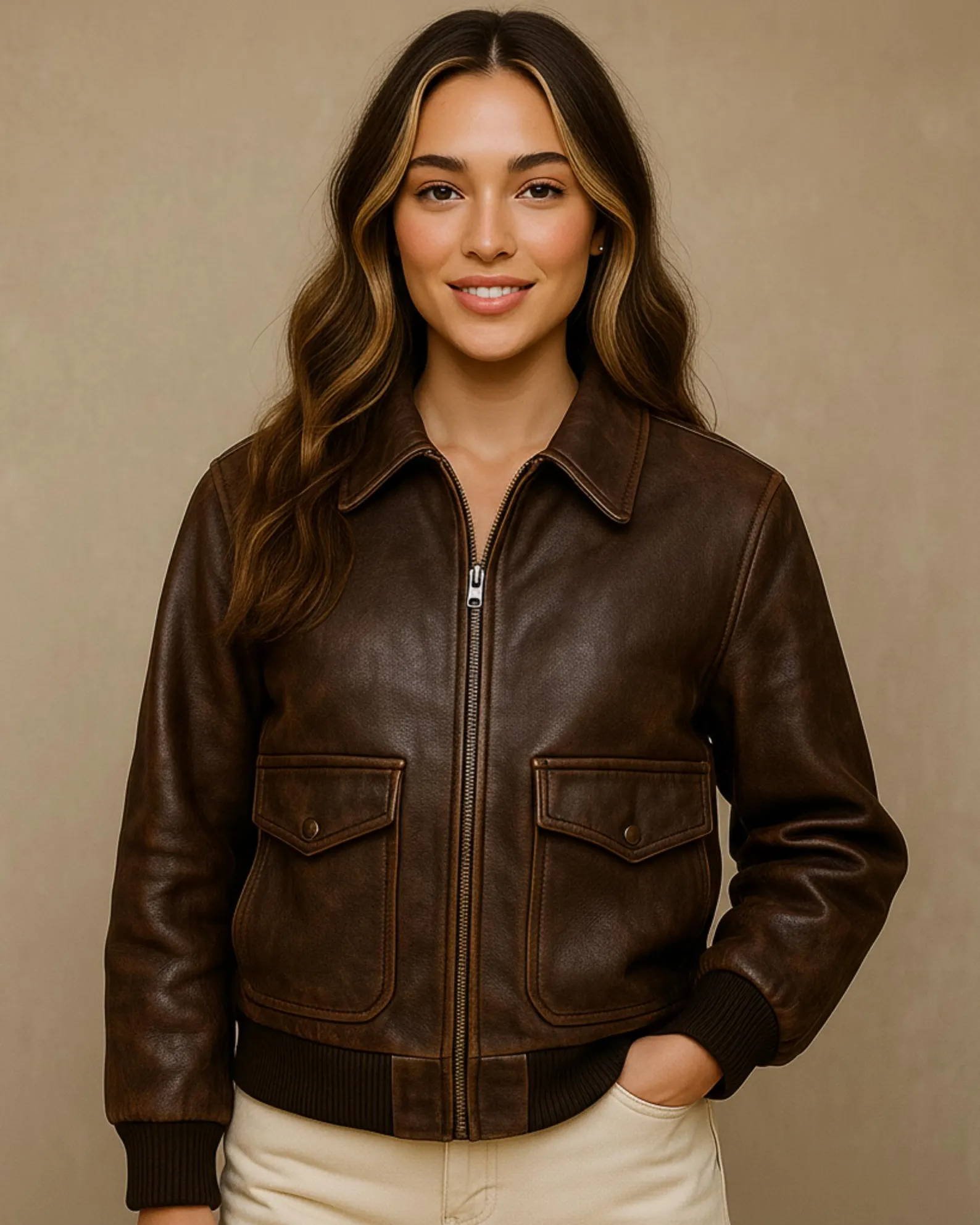 Elevate your style with this timeless women’s leather bomber jacket, blending minimalist elegance with vintage charm. Perfect for minimalists, retro enthusiasts, and luxury lovers, this handmade jacket offers both fashion and function. Choose from full-grain, top-grain, or genuine leather for unbeatable quality and longevity. The classic aviator-inspired design with ribbed cuffs, collar, and hem delivers a timeless silhouette that works for every occasion. Inside, a 100% cotton lining ensures breathable comfort year-round.